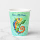 Estas tazas de papel son una mezcla de tonos azules y verdes con un lagarto de fantasía festivo de colores brillantes de verde, azul, amarillo, naranja sosteniendo una hoja verde sobre un palo. Personalizar el texto Feliz Cumpleaños con las plantillas en la parte delantera y trasera.
