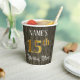 Este elegante y elegante diseño de taza de papel de cumpleaños incluye un nombre personalizado y el mensaje "Fiesta de cumpleaños número 15". El gran número "15th" tiene un patrón de color falso/imitación de inspiración dorada, las palabras "Birthday Party" están en un texto opulento de estilo de escritura, y el fondo tiene un patrón de imitación/imitación inspirado en los granos de madera. Lujosas tazas de papel ornamentales como esta podrían ser útiles en una celebración/fiesta de cumpleaños que se lleva a cabo para celebrar el 15 cumpleaños de alguien. [~Z0000568]