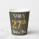 Este lujoso y elegante diseño de tazas de papel con temática de cumpleaños incluye un nombre personalizado y el mensaje "27th Birthday Party". El gran número "27th" tiene un patrón de color falso/imitación de inspiración dorada, y las palabras "Birthday Party" están en un texto elegante de estilo de escritura. El fondo tiene un patrón imitación/falso inspirado en el grano de madera. Las opulentas tazas de papel como esta pueden ser usadas en una fiesta de cumpleaños que se celebra para celebrar el cumpleaños 27 de alguien. [~Z0000568]