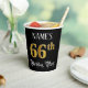 Este elegante y ornamentado diseño de taza de papel de cumpleaños presenta un nombre personalizado y el mensaje "Fiesta de cumpleaños número 66". El gran número "66th" tiene un patrón de color falso/imitación de inspiración dorada, y las palabras "Birthday Party" están en un texto opulento de estilo de escritura. El fondo es negro de color de forma predeterminada (aunque se puede personalizar). Lujosos y lujosos vasos de papel como este podrían ser usados en una fiesta de cumpleaños/celebración que se lleva a cabo en celebración del 66º cumpleaños de alguien. [~Z0000567]