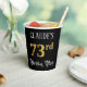 Este diseño ornamentado y elegante de tazas de papel de cumpleaños incluye un nombre personalizado y el mensaje "73rd Birthday Party". El gran número "73" tiene un patrón de color inspirado en el oro de imitación/imitación, y las palabras "Partido Cumpleaños" están en un elegante texto estilo escritura. El fondo es negro de color de forma predeterminada (aunque se puede personalizar). Elegantes y lujosas tazas de papel como esta podrían ser usadas en una celebración/fiesta de cumpleaños que se lleva a cabo para honrar el 73 cumpleaños de alguien. [~Z0000567]