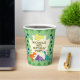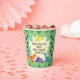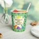 Cute de papel de la fiesta de cumpleaños de los dinosaurios con dinosaurios amarillos, azules, naranjas y morados sobre un fondo follaje verde. Estas adorables tazas también tienen plantillas para que pueda agregar sus propios detalles para el día especial de su hijo.