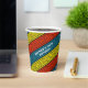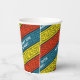 Añada el nombre y edad del niño de cumpleaños o del chica a estas coloridas tazas de papel fiesta que le dan un toque moderno a una franja celta. Usa "Personaliza esta plantilla" para ajustar el texto de "Cumpleaños 30 de Matthew!" a tu nombre, edad y evento preferido. El texto blanco se sienta sobre rayas de rojo, amarillo y azul sobre un azul oscuro.