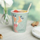 Fun sage green roller patinando tazas de papel de cumpleaños con un ilustracion retro inspirado en patines naranjas ligeros sobre un chica usando medias de rayas rojas y "Let's Roll" en un guión de estilo de los años 70. Añada su nombre tipografía azul verde azulado oscuro.