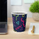 Volver a los años 80 y 90 con fiesta de cumpleaños Copa de papel con formas retro abstractas y confetti diseñadas al estilo memphis en rojo, amarillo, azul y verde sobre fondo azul oscuro.