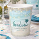 Las tazas rústicas de papel con temática playera cuentan con una bonita escena de playa pastel con olas de color azul acuático que llegan a la orilla, enmarcadas con madera rústica templada, y decoradas en la parte superior con luces de cuerda. La palabra Graduado está coronada con una tapa de grado, y el nombre de los graduados y el año de clase están por debajo.