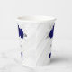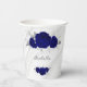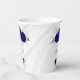 Hermosas flores azul real y hojas gris plata en taza de papel de fondo de mármol