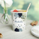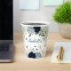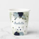 Hermosas y románticas flores azul polvoriento y azul marino con hojas verdes fiesta botánico taza de papel.