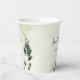 Taza de papel botánico hermoso con flores blancas románticas con hojas verdes.