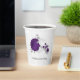Flores románticas de color púrpura real y blanco con taza de papel botánico de hojas de plata.