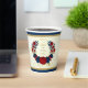 Flores románticas rojo oscuro y azul marino con hojas doradas en vaso de papel botánico.