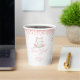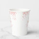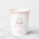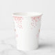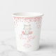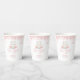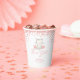 Cuidados vasos de papel para la ducha de bebé, perfectos para una niña en camino. El diseño está decorado con flores de rosa brillante y un ilustracion gatito dulce.