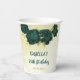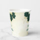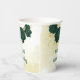 Hermosa taza de papel con flores verde esmeralda y hojas doradas.