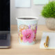 Este hermoso vaso de papel presenta flores de hibisco rosas y naranjas rodeadas de conchas marinas con un fondo de agua azul claro. Perfecto para un luau o una sirena fiesta.