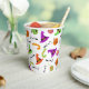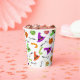 Divertidas tazas de papel de Halloween con caramelos, calabazas y gorras de brujas en naranja, verde y morado sobre un fondo blanco. Estas tazas de papel serían excelentes para una fiesta de cumpleaños temática de Halloween o para un fiesta de disfraces de fiesta de Halloween.