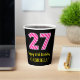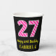 Este alegre diseño de pegatina cuadrado con temática de cumpleaños cuenta con un gran número "27", con rayas rosa claro y rosa oscuro. También incluye el mensaje "Feliz cumpleaños número 27", y un nombre personalizado. El fondo es negro de color. Se pueden usar vasos de papel como este para celebrar el 27 cumpleaños de alguien. [~Z0000580]
