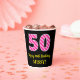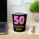 Este alegre diseño de pegatina cuadrado con temática de cumpleaños incluye un gran número "50" con un patrón de franjas rosa claro y rosa oscuro, junto con el mensaje "Feliz cumpleaños número 50", y un nombre personalizado. El fondo es negro de color. Unas tazas de papel alegres como esta pueden ser divertidas de usar en un fiesta en honor al cumpleaños 50 de alguien. [~Z0000580]