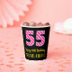 Este alegre diseño de pegatina cuadrado con temática de cumpleaños incluye un gran número "55" con un patrón de franjas rosadas oscuras y rosas claras, junto con el mensaje "Feliz cumpleaños número 55", más un nombre personalizado. El fondo es negro de color. Se pueden usar vasos de papel como este en un fiesta que se celebra por los cincuenta años de alguien. [~Z0000580]