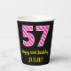 Este alegre diseño de pegatina cuadrado con temática de cumpleaños incluye un gran número "57" con un patrón de franjas rosa oscuro y rosa claro, junto con el mensaje "Feliz cumpleaños número 57", más un nombre de personalizable. El fondo es negro de color. Las tazas de papel temáticas de cumpleaños como esta podrían ser una manera divertida de celebrar el 57 cumpleaños de alguien. [~Z0000580]
