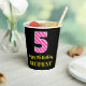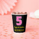 Este alegre diseño de pegatina cuadrado con temática de cumpleaños cuenta con un gran número "5", con un diseño de rayas rosa claro y rosa oscuro. También incluye el mensaje "Feliz quinto cumpleaños", más un nombre personalizado. El fondo es negro de color. Joyosos vasos de papel con temas de cumpleaños como este podrían ser usados en un fiesta para celebrar el quinto cumpleaños de alguien. [~Z0000580]