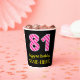 Este alegre diseño de pegatina cuadrado con temática de cumpleaños cuenta con un gran número "81", con rayas rosa claro y rosa oscuro. También incluye el mensaje "Feliz cumpleaños número 81", y un nombre personalizado. El fondo es negro de color. Joyosos vasos de papel con temas de cumpleaños como este podrían ser usados en una fiesta de cumpleaños que celebra el 81 cumpleaños de alguien. [~Z0000580]