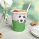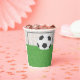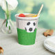 Un fútbol y un gol sobre hierba verde. Este diseño parece realmente efectivo en estas tazas de papel