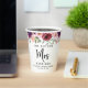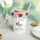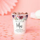 Tazas de papel personalizadas modernas "La futura Sra" para su despedida de soltera. La parte superior presenta flores de acuarela en color burdeos, rojo y rosa pálido y vegetación y "Sra" escrito en una elegante letra cursiva grande. Personalice con su futuro apellido de casada, nombre y fecha de la fiesta.