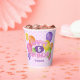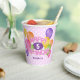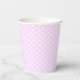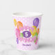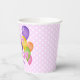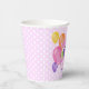 Estas divertidas y coloridas tazas de papel para fiestas de cumpleaños incluyen el mensaje "Feliz cumpleaños" escrito en galletas de corte rosa espumosas y realistas rodeadas de globos multicolores - la edad y el nombre del niño se pueden personalizar - fondo es un patrón de pequeños puntos de polka blancos sobre rosa pálido - de katz_d_zynes