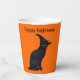 Un lindo gato negro se sienta contentosamente usando una estrella y una luna adornada con brujas negras gorra. Las palabras Feliz Halloween se pueden cambiar fácilmente a cualquier texto.