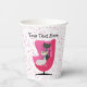 Estas tazas de papel son blancas con puntos rosados brillantes y una silla de estilo de mediados de siglo, en tonos rosas, con un gato negro y blanco de aspecto elegante sentado en la silla. Personalizar el texto con las plantillas en la parte delantera y posterior.