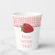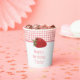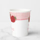 Estos vasos de papel están listos para ser personalizados con sus propios mensajes con un punto para añadir un mensaje en el frente y en la parte posterior. Presentan un borde de gingham rosa acentuado con fresas rojas maduras. Sus mensajes aparecen en la coordinación de las letras rosas.