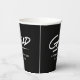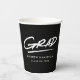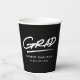 Modernas tazas de papel de graduación con "Grad" mostradas con letras blancas y manuscritas con un subrayado discontinuo sobre un fondo negro (o color de su elección). Personalice las tazas de papel de graduación en blanco y negro añadiendo el nombre y el año de graduación. El diseño se repite en la parte posterior. ¡Las tazas personalizadas de papel para la graduación son perfectas tanto para fiestas de bachillerato como universitarios!