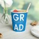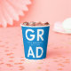 Copas de papel de graduación personalizadas con "Grad" en letras en negrita y blanco con un fondo azul o color de su elección. Personalice las tazas de papel de graduación añadiendo el nombre y el año de graduación. Las tazas azules de papel para la graduación son perfectas tanto para fiestas de bachillerato como universitarios.