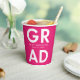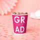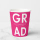 Copas de papel de graduación personalizadas con "Grad" en letras en negrita y blanco con fondo rosa caliente o color de su elección. Personalice las tazas de papel de graduación añadiendo el nombre y el año de graduación. Las tazas de papel de graduación rosadas son perfectas tanto para fiestas de educación secundaria como universitarios.