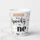Gray Spooky One Halloween 1st Birthday Paper Cups Cute niños modernos Halloween primera copa de papel de cumpleaños en color marrón, negro y gris naranja. Este diseño presenta un bonito fantasma, arañas, huesos, estrellas y murciélagos sobre un fondo gris. Estos chicos espantaron una copa de papel de primer cumpleaños con tema de Halloween es ideal para una fiesta de primer cumpleaños en octubre.