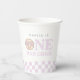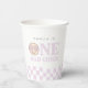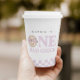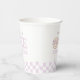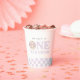 Celebra tus chicas groovy en la fiesta de primer cumpleaños con nuestra juguetona vajilla de regalo de cumpleaños 'ONE RAD CHICK', vajilla desechable de mesa de la taza de papel. Este diseño presenta una cara feliz fácil de amar con gafas de señas de paz y patrones de cuadros ondulados rosados.
