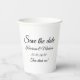 Guardar la fecha, guión personalizado personalizado, Invitación de Boda de texto caligrafía elegante fiesta de compromiso lindo y divertido Cups de papel. Guión personalizable completo texto negro y fondo blanco de color sólido y plano.
