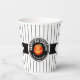 Este vaso de papel muestra una calabaza de Halloween en una etiqueta negra redonda con el texto 'Halloween feliz'. Personaliza con tu nombre u otro texto. El fondo es un estrecho patrón rayado en blanco y negro. Busque ID212 para ver otros productos con este diseño.