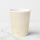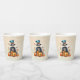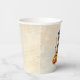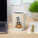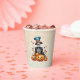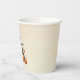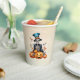 Copa de papel Skeleton de Halloween. Colorida taza de papel de Halloween con una taza de papel sonriente. Skeleton lleva puesto un sombrero superior y se sienta sobre calabazas.