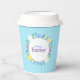 Happy Easter paper cups decorated with flowers and eggs on blue background