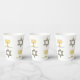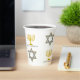 Elegantes tazas de papel HAPPY HANUKKAH que muestran la falsa estrella de oro y plata de DAVID y MENORAH en un patrón de baldosas. El texto lee FELIZ HANUKKAH y es PERSONALIZABLE, así que puedes PERSONALIZARLO agregando tu nombre u otro texto. Ideal para las celebraciones de Hanukkah.