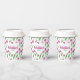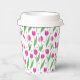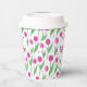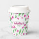 Happy Valentine's day paper cups decorated with pink tulip pattern on white background.