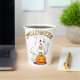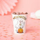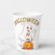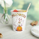 Un buen fantasma sonriente, con una calabaza sonriente, que nos saluda por un fiesta feliz.