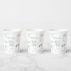 Estas ilustraciones de doodle de playa dibujadas a mano en vasos de papel para despedida de soltera muestran un fondo blanco crujiente envuelto en garabatos costeros azules polvorientos y caprichosos: olas, conchas, estrellas de mar, gafas de sol, destellos e iconos de playa divertidos. Centrado en la taza hay texto totalmente editable que dice "Despedida de soltera", con espacio arriba para agregar el nombre de la novia y debajo para incluir la fecha. El diseño es moderno, playero y completamente personalizable, lo que hace que estos vasos sean perfectos para unir un tema de despedida de soltera costera.