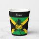 Patriotic Jamaican birthday party personalised paper cups. This colourful design features a Jamaican flag front and back, with black tropical palm tree silhouettes. The customisable text on the front can be changed to add names or a message. Text on the back says HAPPY BIRTHDAY, but this can also be customised if you prefer