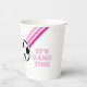 ¡Es el momento del juego! Fútbol tazas de papel de cumpleaños con rayas rosas y pelota de fútbol.