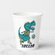 Un fiesta fresco para celebrar después de un partido de fútbol, este diseño tiene un colorido dinosaurio de T-Rex en verde verde azulado con una camisa rayada amarilla y negra de árbitro que patea una pelota de fútbol. La plantilla de texto se puede personalizar o dejar como está con la palabra "SOCCER" en negrita.
