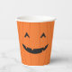 Tazas de papel de Halloween con la cara de una calabaza de harina de plumas de jack-o-lantern. Tienen un esquema de color naranja y negro.