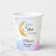 Celebrate a whimsical celestial baby shower with these charming paper cups. The design features a gold crescent moon and scattered stars set against a soft watercolor blue and purple wash. These are perfect for serving hot or cold beverages to guests with a little star is brewing or twinkle twinkle theme baby shower.