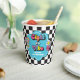 El ocho retro de Neon 90 es un vibrante tazas de papel de 8º cumpleaños con corazones, margaritas, bola de disco y fondo de damas.